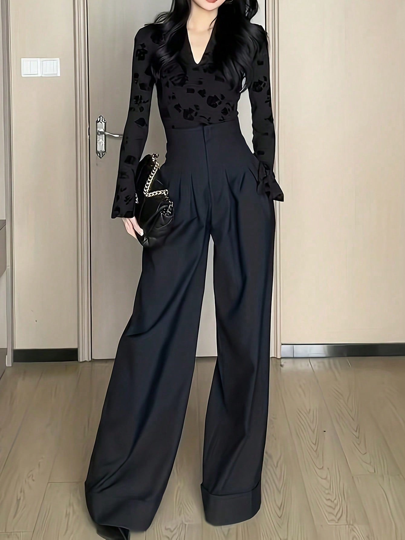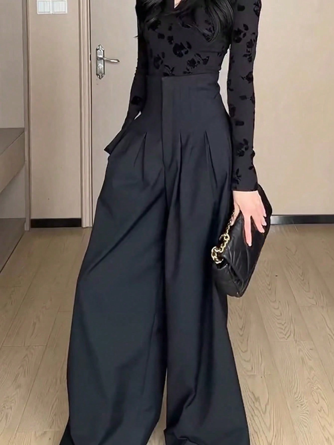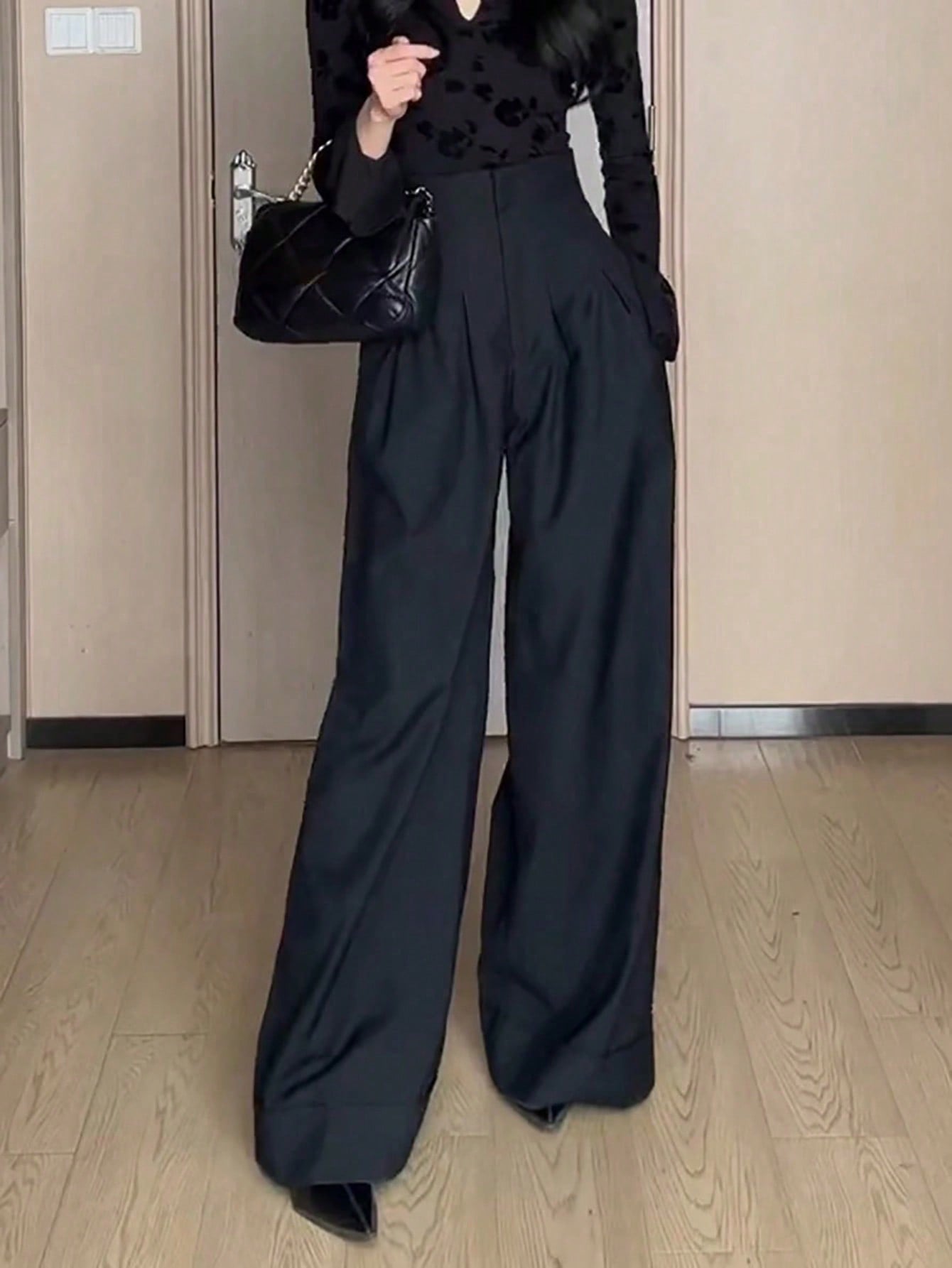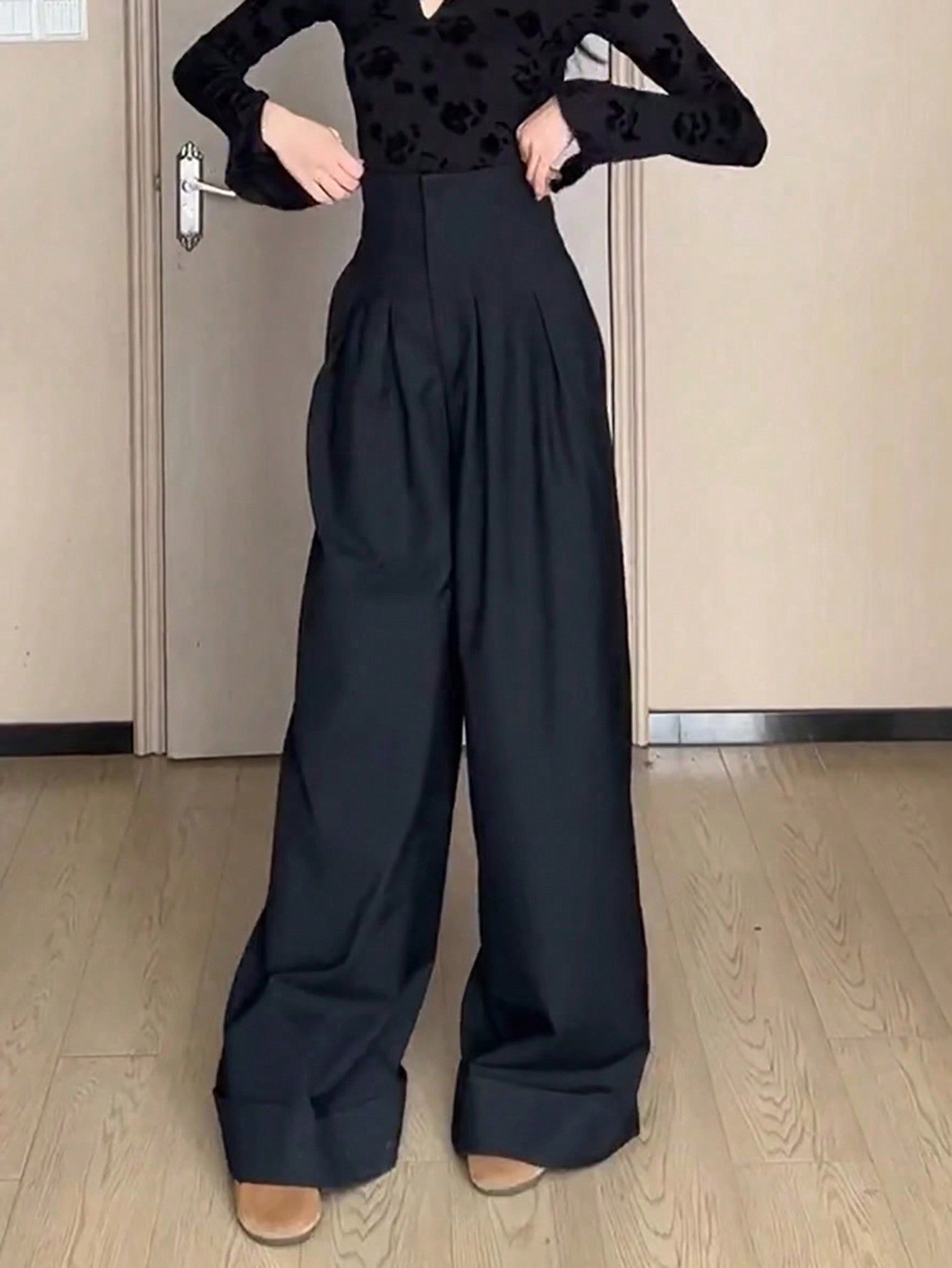 Solid Color High Waist Pleated Wide Leg Pants With Slanted Pockets